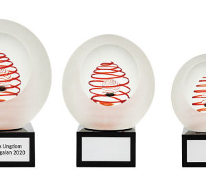 Designad glasboll i frostat glas monterad på svart glassockel-