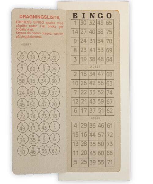 Expressbingo fungerar precis som en vanlig bingobricka bortsett från att nummerdragningen redan finns på insidan av luckan när den öppnas. Användaren följer helt enkelt dragningen på lucksidan och markerar numret på spelplanen. Smidigare blir det inte. Full bricka ger högsta vinst och det finns vinster ner till en rad. Expressbingo levereras i satser om 1008 brickor och samtliga brickors dragningslistor är olika. Varje bricka har även en tryckt vinstplan på baksidan. Det går bra att trycka föreningsnamn samt reklam också på baksidan. Kontrollista för vinster medföljer. Det finns två typer Expressbingo, 5kr och 10kr.